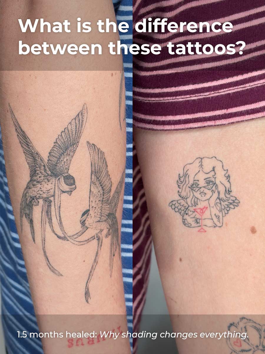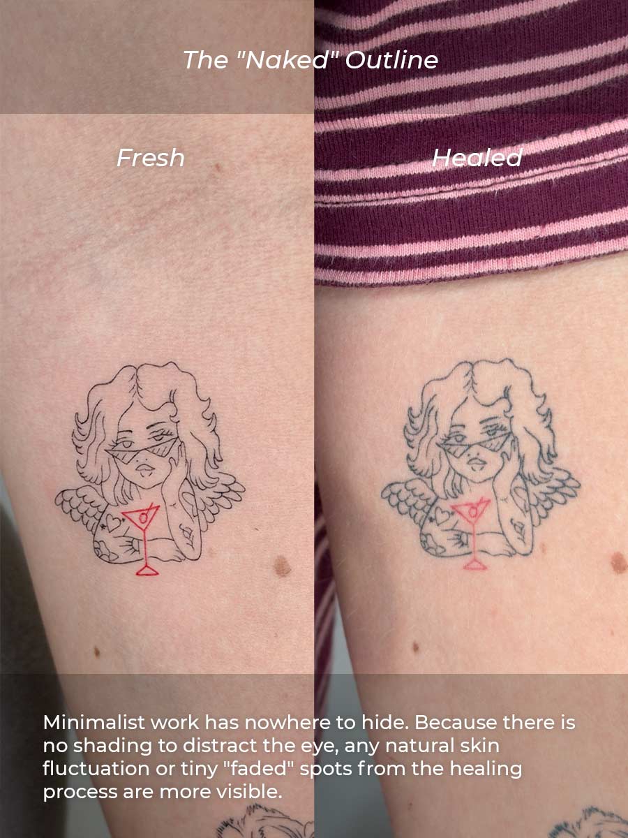 • The "Healed Look": Fine-line and minimalistic tattoos have a specific look once healed. They often do not look like solid, "stamped" outlines—this is completely normal for tattoos in general and simply more noticeable on delicate work.