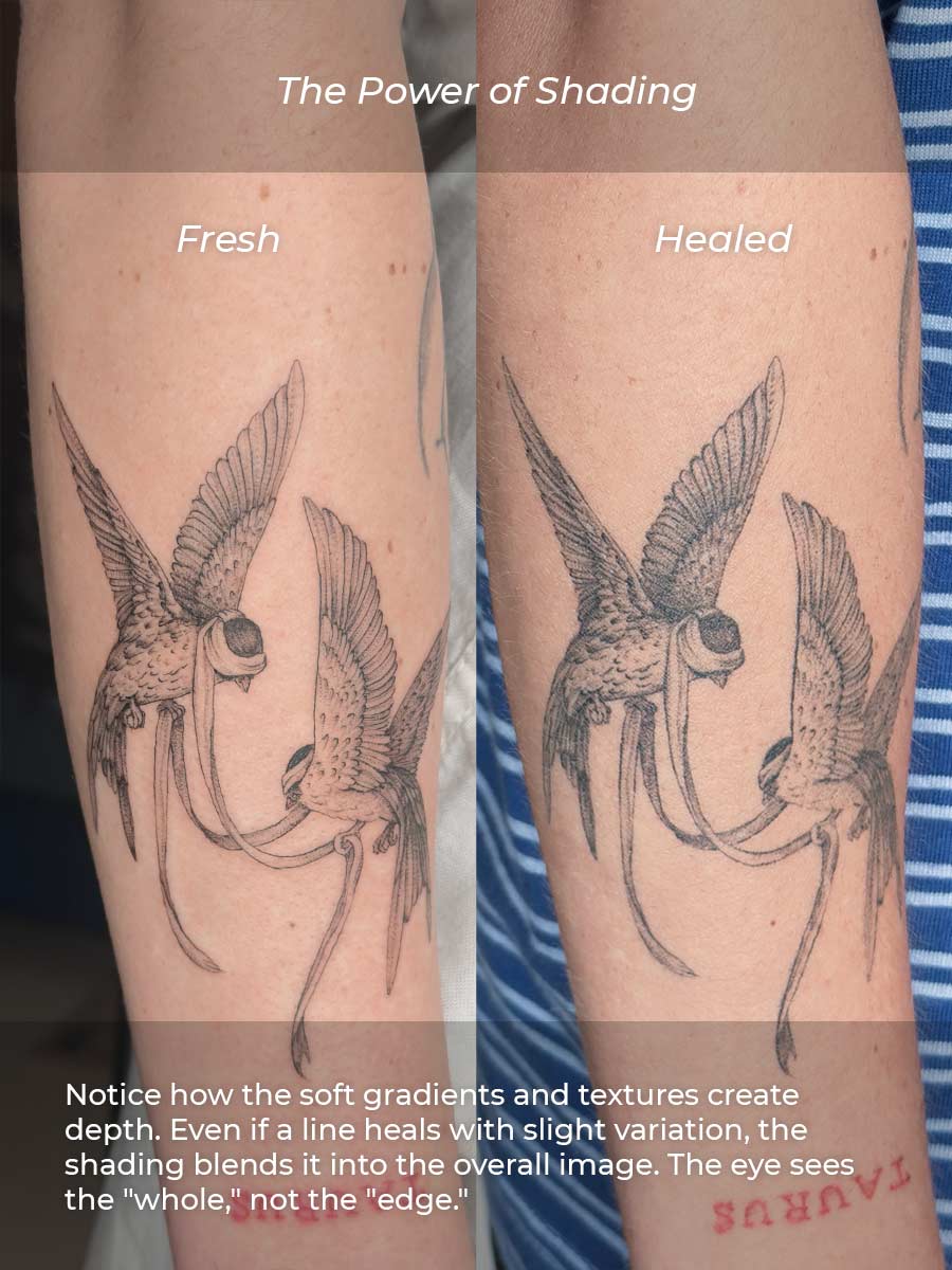 In micro-realistic tattoos—like the birds shown above—we use a combination of delicate outlines and soft grey-wash shading. This shading creates a "masking effect."
