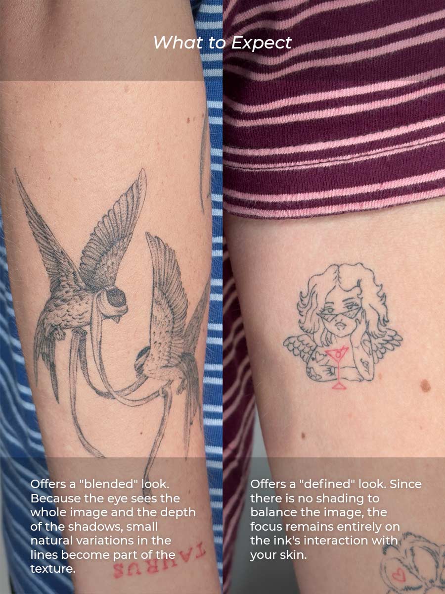 While both styles fall under the "fine line" umbrella, they behave very differently once the healing process is complete. The main difference lies in visual focus and how much "space" the design gives the eye.